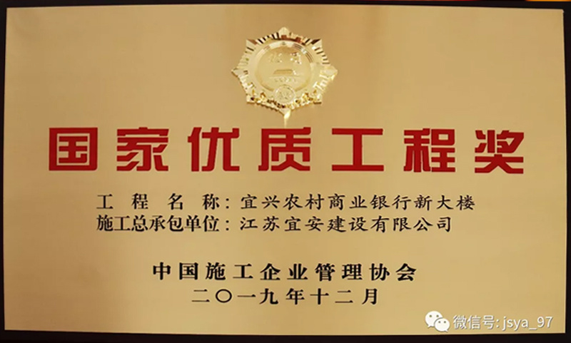12月8日至10日,2018-2019年國家優質工程獎表彰頒獎會和中國建設工程魯班獎(國家優質工程)表彰大會相繼在北京召開。會議對獲得2018-2019年國家優質工程獎和中國建設工程魯班獎的獲獎單位進行了表彰,宜安建設承建的宜興農村商業銀行新大樓工程、參建的月亮灣B05(DK20100288)地塊項目、思齊路以西地塊商服樓項目獲國家優質工程獎;以及參建的園區設計院辦公大樓獲中國建設工程魯班獎。