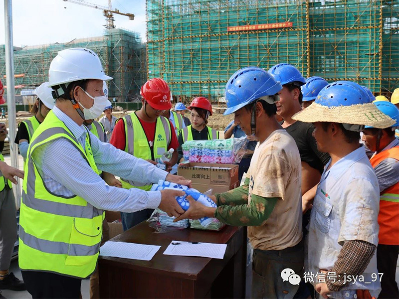 剛剛結束了梅雨天氣,卻又迎來了酷暑難耐的高溫氣候。連日來,驕陽似火,高溫天氣炙烤著每一個戶外工作者,施工現場就像一個大火爐,熱浪翻騰,揮汗如雨。勞動者們不懼高溫,搶工期、保進度,奮戰在施工一線。宜安建設的主要領導心系項目一線,董事長兼總經理黃建明、副總經理黃富康等一行人蒞臨宜興和無錫主要在建項目現場,為堅守在一線崗位的職工們送來了防暑降溫的生活用品。